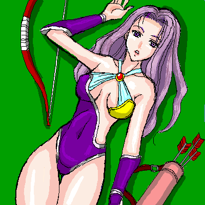 1girlarrow (projectile)bow (weapon)breastsfemale focuslong hairoekakipurple eyespurple hairretro artstylesoloweapon
