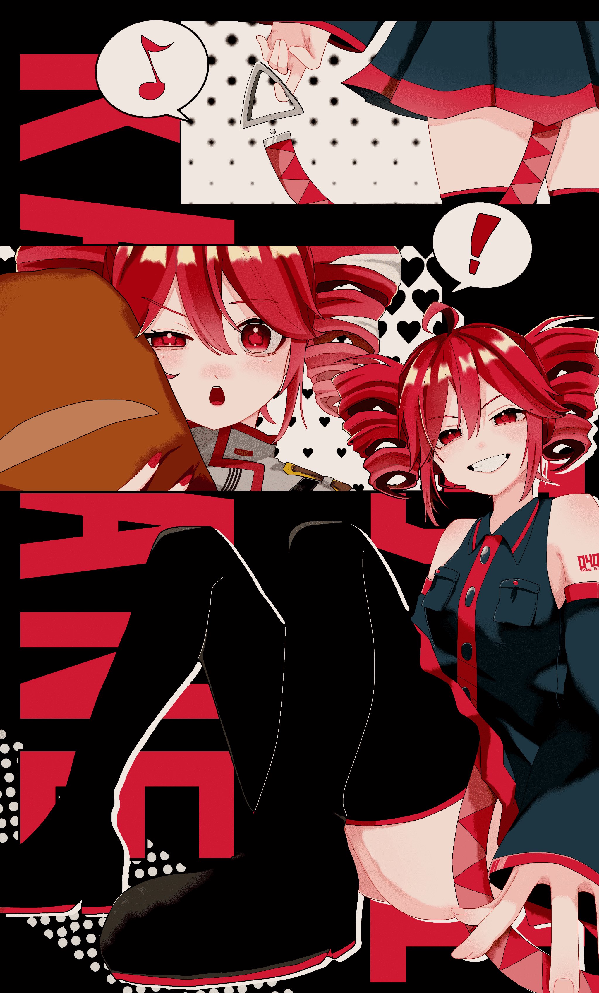 baguettebare shouldersblack bootsbootsbreadcharacter namedetached sleevesdrill hairfoodgrey shirtgrinhalf-closed eyeknees uplong sleeveslooking at viewerminiskirtmultiple boysmusical notenail polishopen mouthred eyesred hairred nailsshirtskirtsleevelesssleeveless shirtsmilespoken musical notethigh bootstwin drills