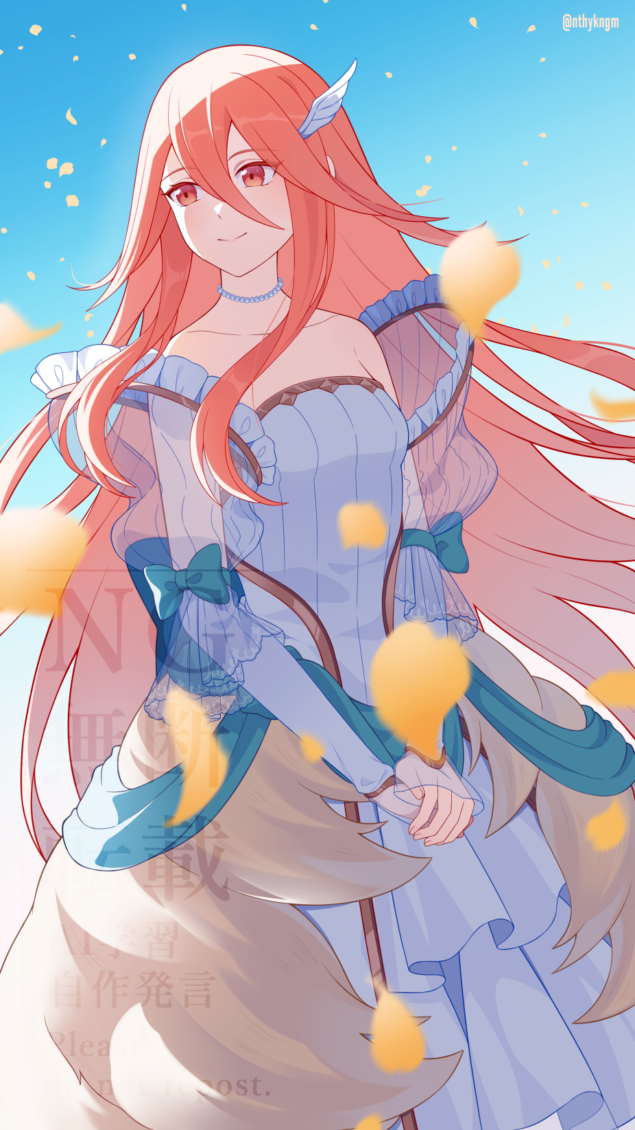 1girlbare shouldersbreastsbridal gauntletsbrideclosed mouthcollarbonedetached sleevesdresshair ornamentjewelrylong hairlong sleevesnecklaceoff shoulderoff-shoulder dressofficial alternate costumepearl necklacepetalsred eyesred hairsee-through clothessee-through sleevessmall breastssmilesolovery long hairwedding dresswhite dresswing hair ornament