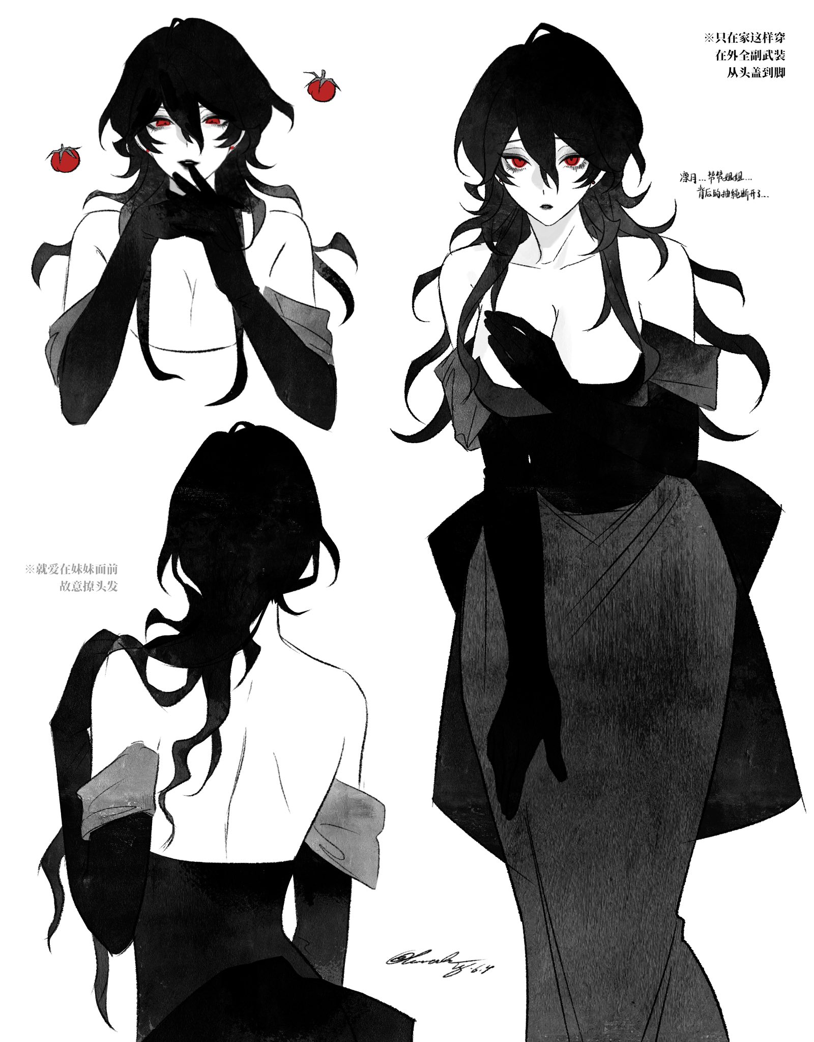 1girlbare shouldersblack hairbreastscleavagedresselbow glovesgenderswapgenderswap (mtf)gloveshair between eyeslarge breastslong hairlooking at viewerlunaticotatmonochromered eyessimple backgroundwhite background