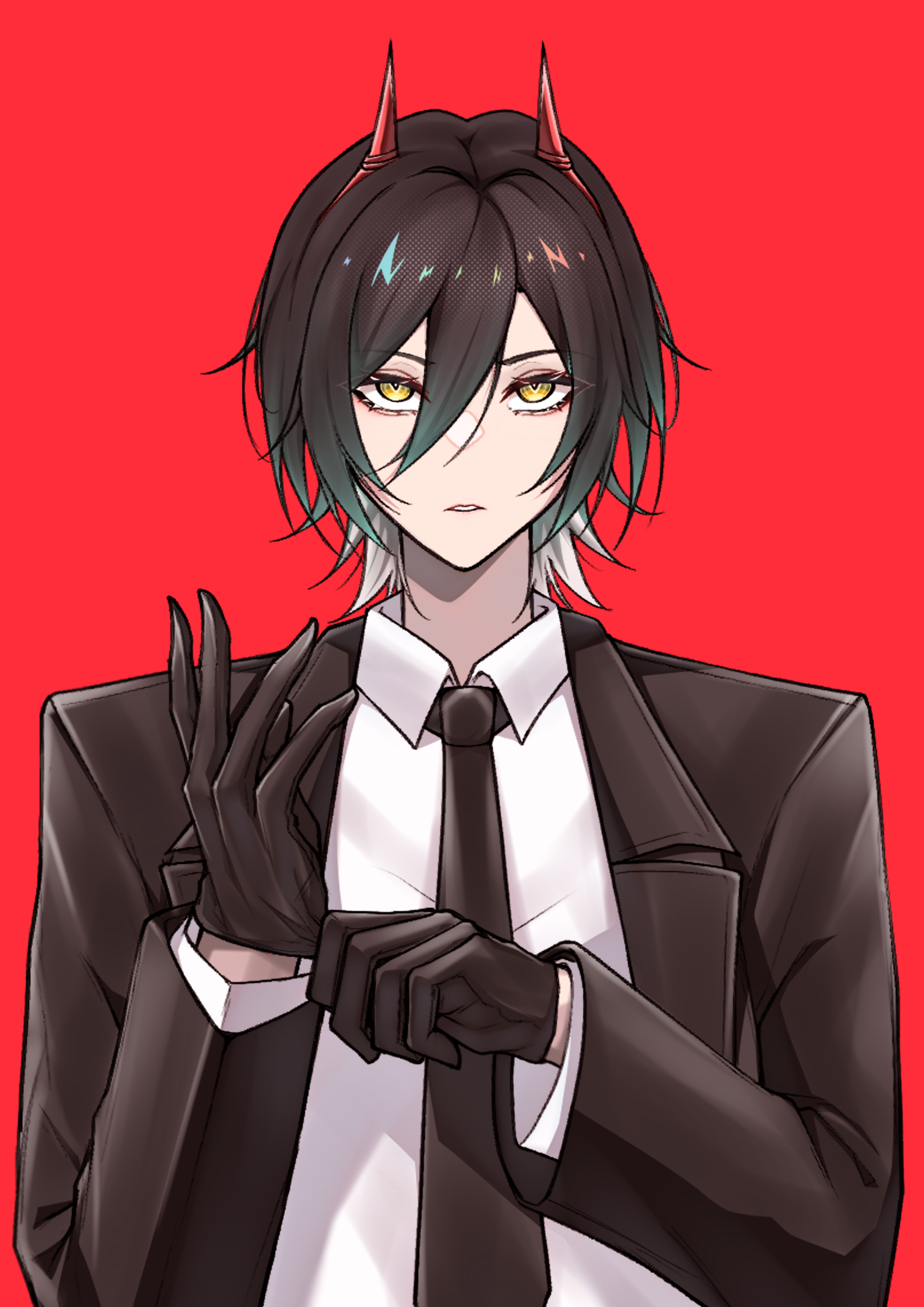 1girlalternate costumeblack glovesblack hairblack jacketblack necktieblack suitbusiness suitcollared shirtformal clothesgloveshair between eyeshornsjacketlapelsleatherleather gloveslong sleeveslooking at viewermechanical hornsmulticolored hairnecktienotched lapelsopen mouthparted lipsputting on glovesred backgroundred hornsshirtshort hairsimple backgroundslit pupilssolosuitsuit jackettwo-tone hairupper bodywhite hairwhite shirtyellow eyes