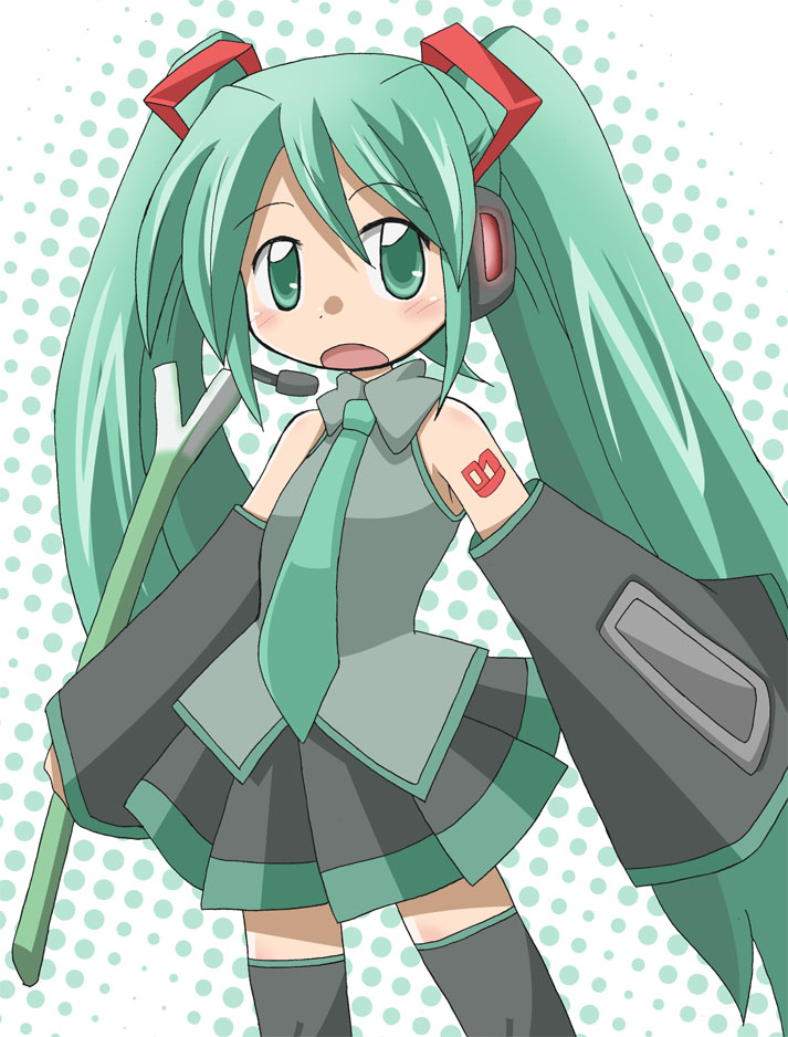 detached sleevesgreen eyesgreen hairheadsetlong hairnecktieskirtsolospring onionthighhighstwintailszettai ryouiki