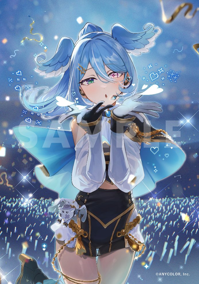 1girlblack glovesblack shoesblack shortsblue hairblue themeblurrycompany namecopyright noticedepth of fieldglovesglowstickgreen eyeshair between eyeshair ornamenthaircliphead wingsheadsetheartheterochromialeg uplooking at viewermulticolored hairnijisanji idol uniformofficial alternate costumeofficial alternate hairstylepenlight (glowstick)pink eyesponytailsample watermarkshoesshortssolostreaked hairstreamerssymbol-shaped pupilsvirtual youtuberwatermarkwhite hairwhite shortswings