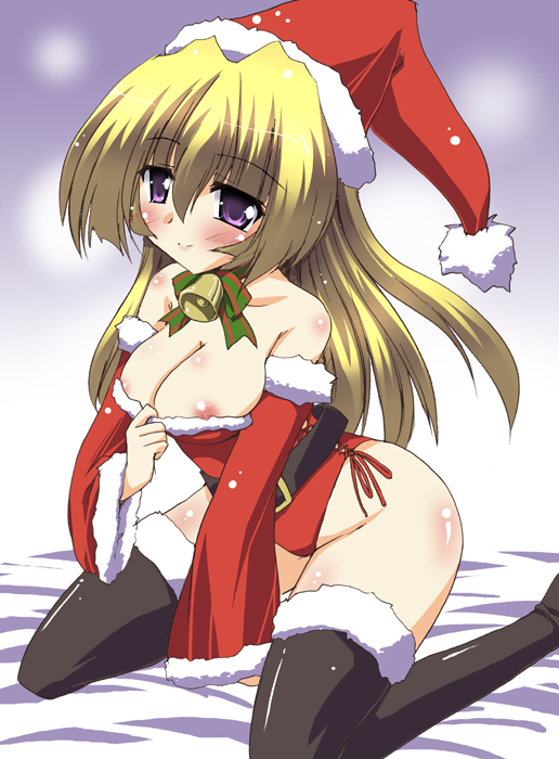 1girlbellbeltblonde hairblushbreastschristmascleavagedetached sleevesfemale focushatkneelinglarge breastsleotardlong hairnipple slipnipplespurple eyesred leotardsanta costumesanta hatsmilesolothighhighs