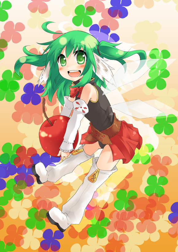 :d1girlahogebare shouldersbeltbootsbowbowtiecarryingcherryfairyfoodfruitgreen hairhead wingsmini personminigirlopen mouthsmilethigh bootsthighhighstwintailswings