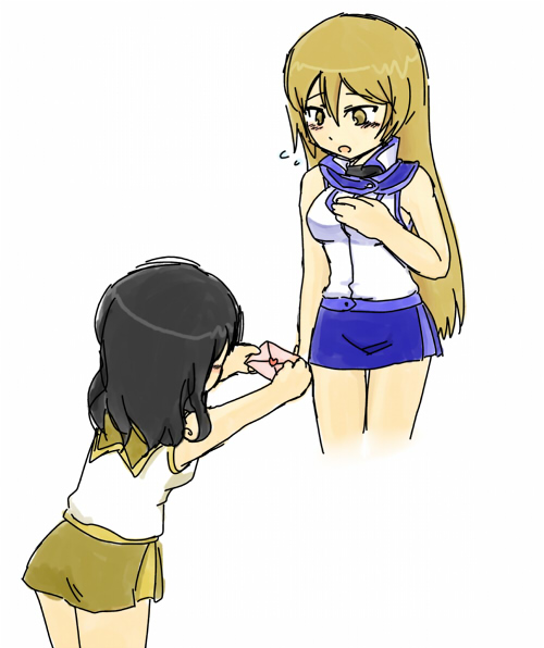 nattydodo 002, ijichi nijika, yamada ryo, bocchi the rock!, absurdres, highres, non-web source, ahoge, black sleeves, blonde hair, blue hair, blue shirt, blush, bow, brown shoes, closed mouth, english text, from side, green jacket, jacket, lifting person, long hair, long sleeves, looking at another, mole, mole under eye, open mouth, pleated skirt, profile, red bow, red shoes, shirt, shoes, short hair, side ponytail, simple background, skirt, smirk, socks, speech bubble, sweatdrop, white background, white shirt, white socks, yellow eyes, yuri