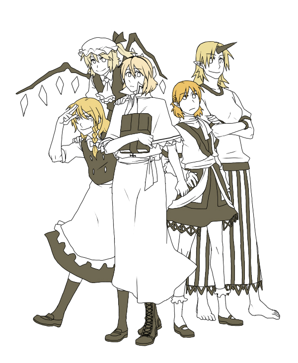 gram 9, hakurei reimu, izayoi sakuya, kirisame marisa, kochiya sanae, touhou, commentary, highres, 4girls, apron, band (music), bare shoulders, black dress, black hair, black hat, black pantyhose, black shoes, blonde hair, blue dress, blue skirt, bow, braided sidelock, cable, detached sleeves, dress, drum, drumsticks, frilled apron, frilled bow, frilled dress, frilled hair tubes, frilled hairband, frills, guitar, hair bow, hair tubes, hairband, hat, holding, holding drumsticks, holding guitar, holding instrument, instrument, lightning bolt symbol, long hair, looking at another, maid, maid apron, maid headdress, microphone stand, multiple girls, open mouth, pantyhose, red bow, red shirt, red skirt, ribbon-trimmed sleeves, ribbon trim, rock (music), sandals, shirt, shoe soles, shoes, short hair, skirt, sleeveless, sleeveless shirt, socks, teeth, white apron, white hair, white hairband, white socks, witch hat