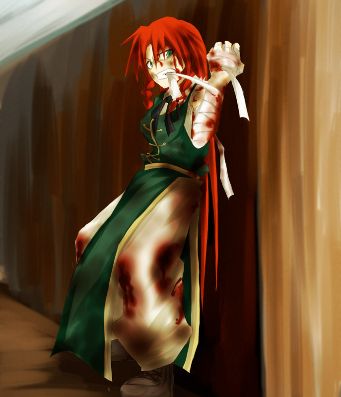 1girlbandagesbleedingbloodbraidchina dresschinese clothesdressfemale focusgreen eyesinjuryred hairsolo