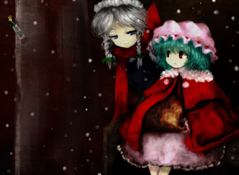 2girlsblue eyesblue hairfemale focusgradient backgroundhairbandhatmanteletmultiple girlsoutdoorsred eyesribbonshort hairsnow