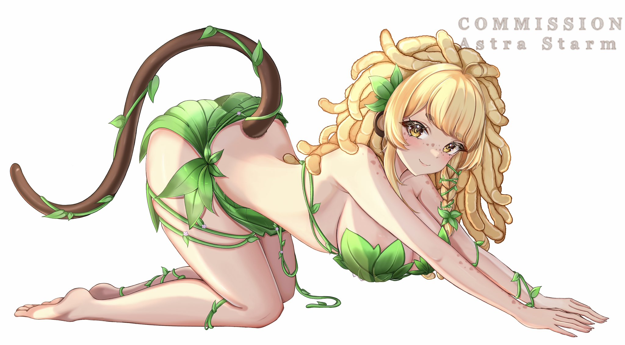 1girlall foursanimal earsastra starmbarefootbikiniblonde hairbreastsclosed mouthfreckleshair ornamentlarge breastsleaf bikinileaf hair ornamentlong hairmonkey earsmonkey girlmonkey tailsmilesoloswimsuittailvirtual youtuberwhite backgroundyellow eyes