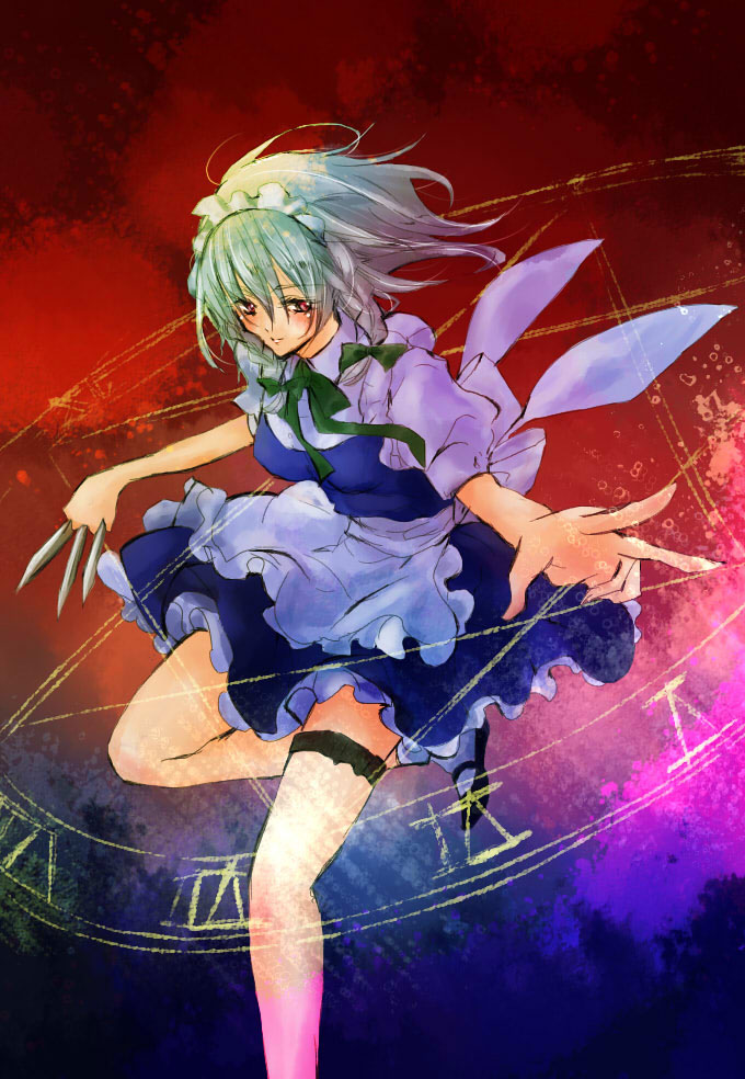 1girlapronbetween fingersfemale focushairbandholdingknifemaidmaid apronred eyesribbonshort hairsolothrowing knifeweapon