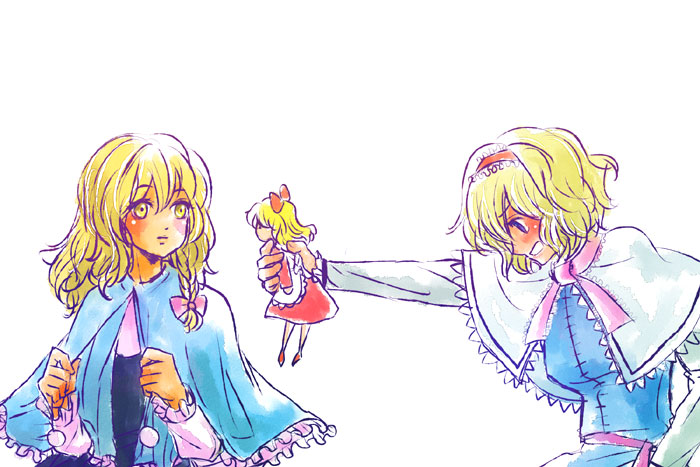 2girlsblonde hairblue eyesblushdollfemale focuslong hairmultiple girlsribbonshort hairyellow eyes