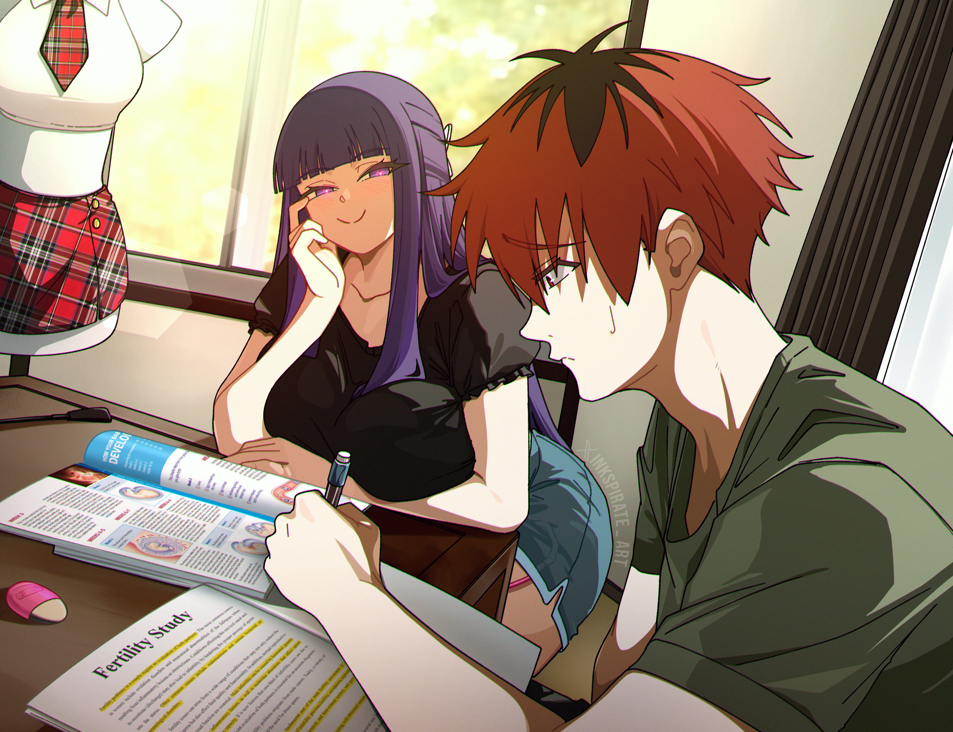 1boy1girlarm supportartist nameblack shirtblue shortsblunt bangsbookc:contemporarycropped shirtenglish texteraserfrom sidefurrowed browgreen shirtheartheart-shaped pupilsindoorslong hairmannequinnaughty facepencilprofilepuffy short sleevespuffy sleevespurple hairred eyesred hairred skirtremote control vibratorsex toyshirtshort sleevesshortssittingskirtsmilesymbol-shaped pupilstabletwitter usernametwitter x logovibratorwhip
