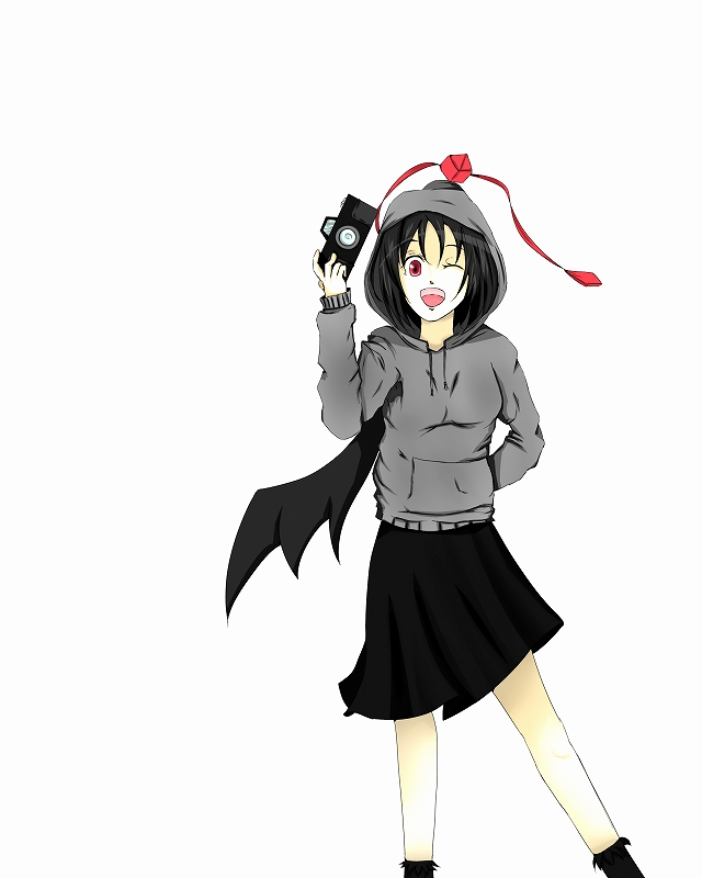 1girlbad anatomyblack hairblack wingscamerafemale focushathoodhooded jacketjacketlooking at vieweropen mouthpoorly drawnsmilesolotokin hatwings