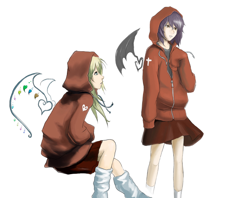 2girlsalternate wingsbat wingsblonde haircontemporaryfemale focushearthoodhooded jacketjacketlong sleevesloose socksmultiple girlssiblingssisterssockswings