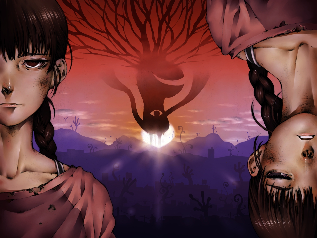 1girlbraidclonedirtyempty eyesexpressionlesshilllooking at viewerno pupilssilhouetteskysunrisesurrealtorn clothestowntwin braidsupside-down