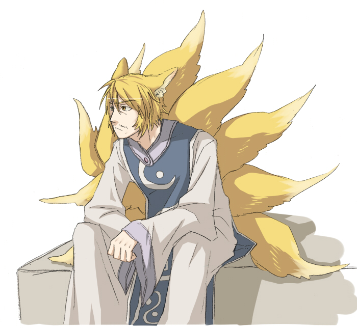 1boyanimal earsblonde hairfacial hairfox earsfox tailgenderswapgenderswap (ftm)kitsunekyuubimale focusmultiple tailsmustacheshort hairsimple backgroundsolosurcoattailwhite backgroundyellow eyes