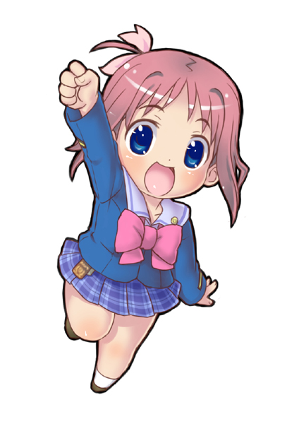 kantoku, kiriyama sakura, sakura musubi, 1girl, barefoot, blue skirt, blush stickers, brown eyes, female focus, green background, pink hair, short hair, skirt, solo, twintails