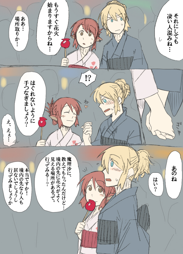 2girlsalternate costumealternate hairstyleblushcomicfemale focushair upjapanese clotheskimonomultiple girlsyukata