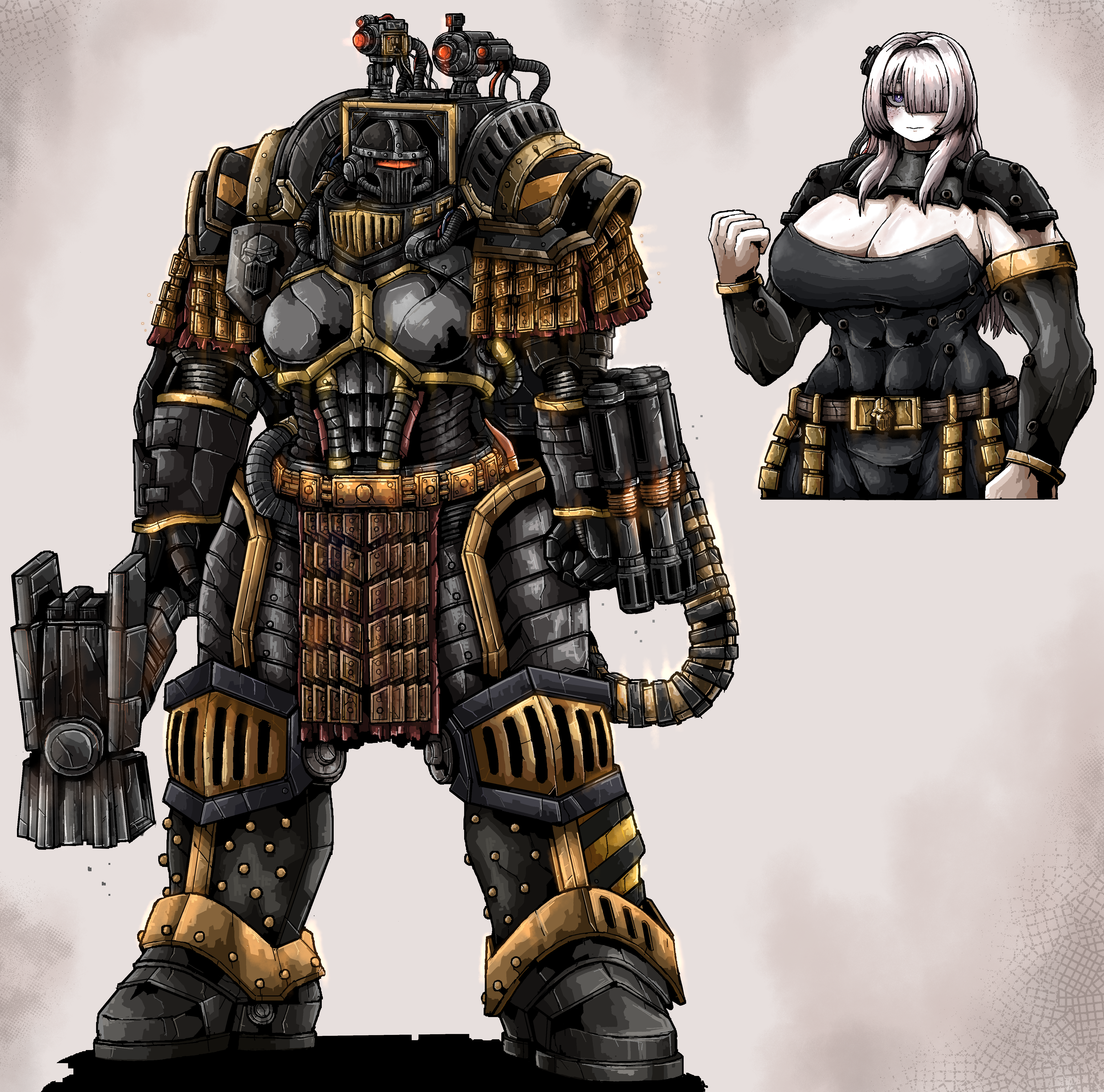 1girlammunition beltarmorbreastplatebreastscleavagecovered abscropped torsodetached sleevesfull armorgenderswapgenderswap (mtf)hair over one eyehammerhelmetholdingholding hammerhuge breastsiron warriorslooking at viewermultiple viewsmuscularmuscular femalepauldronspower armorpurple eyesshoulder armorstorm bolter