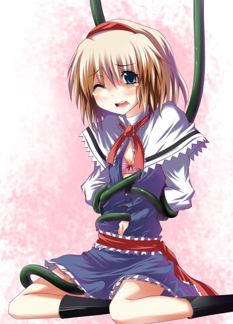 1girlblonde hairblue eyesbootsfemale focusflat chestopen clothesopen shirtshirtsolotearstentacles
