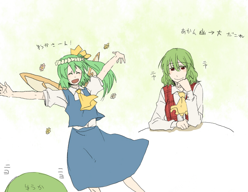 :d2girlsarms upascotclosed eyesdress shirtfemale focusflowergreen hairhead resthead wreathmultiple girlsopen mouthoutstretched armsplaid clothesplaid vestshirtsmilevestwavy mouth