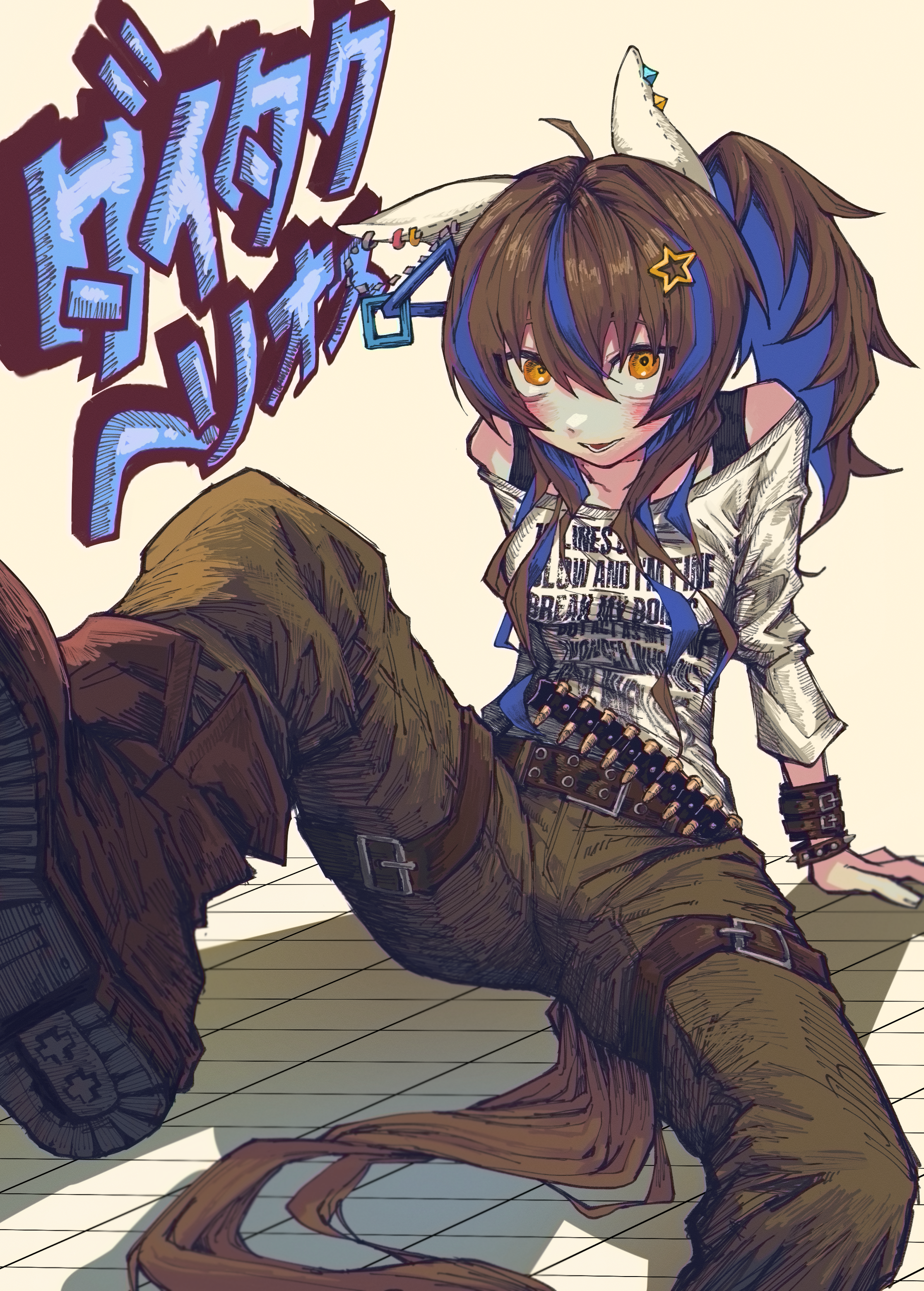 1girlammunition beltanimal earsarm supportblue hairbootsbrown haircharacter nameforeshorteninggreen pantshorse earshorse girlhorse taillooking at viewermulticolored hairorange eyespantsprint shirtshirtsittingsolostreaked hairtail