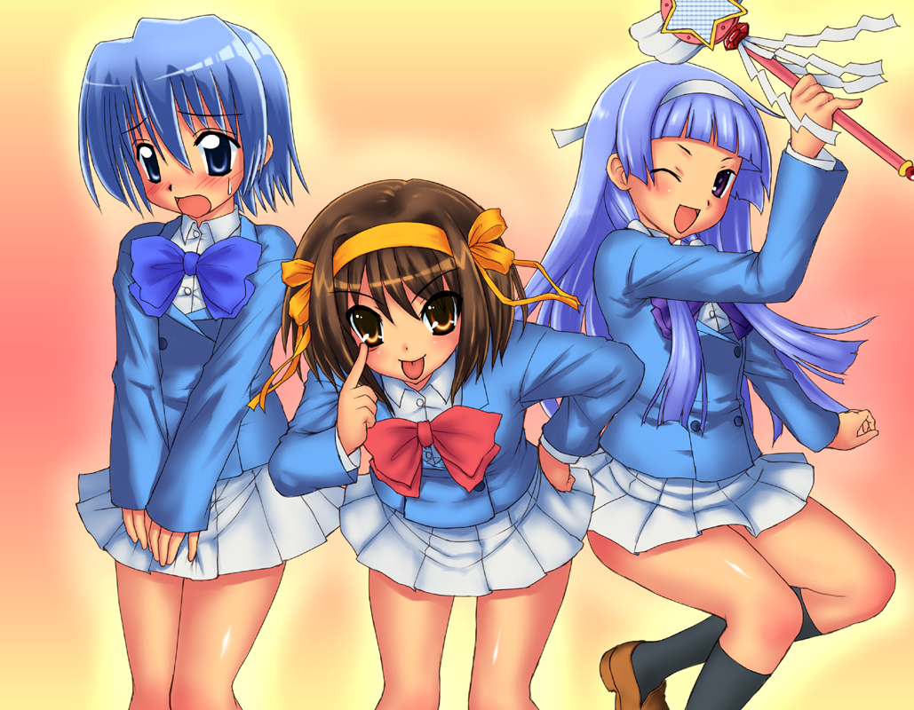 1boy2girlsakanbeakashi kaoru (cosplay)blue eyesblue hairblushbrown eyesbrown haircosplaycrossdressingcrossoverembarrassedeyelid pullhair ornamenthairbandlong hairminiskirtmultiple girlsnogami aoi (cosplay)one eye closedpleated skirtpurple eyesribbonsannomiya shiho (cosplay)school uniformshort hairskirtsmiletonguetongue outtrapvoice actor connectionwandwhite skirtwink