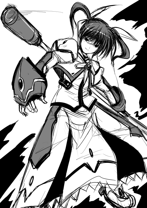 kometani hisanobu, original, 1girl, breasts, cleavage, eyepatch, fantasy, female focus, pointy ears, red hair, simple background, solo
