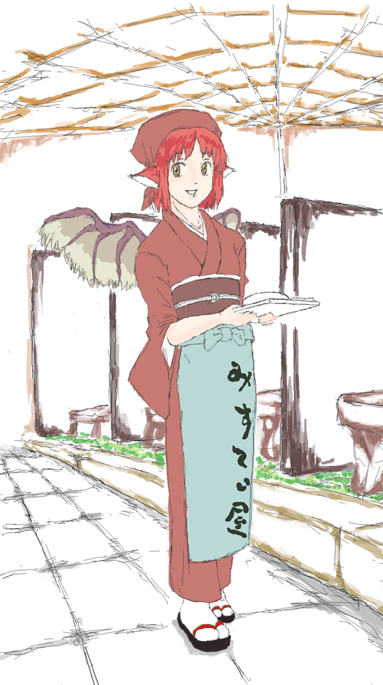 1girlapronbrown headscarffemale focushatheadscarfjapanese clothesobioekakired hairsandalssashshort hairsmilesolotraywide sleeveswingszouri