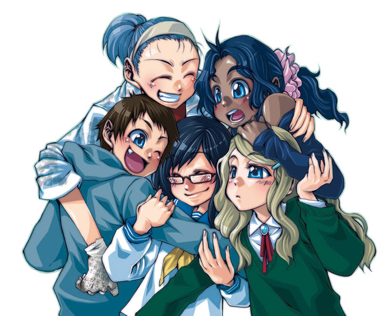 2boys3girlsblack hairblue eyesblue hairblushbrown hairdark skineveryoneglassesglovesgroup hughappyhoodhoodiehugmultiple boysmultiple girlsschool uniformsmilesweater