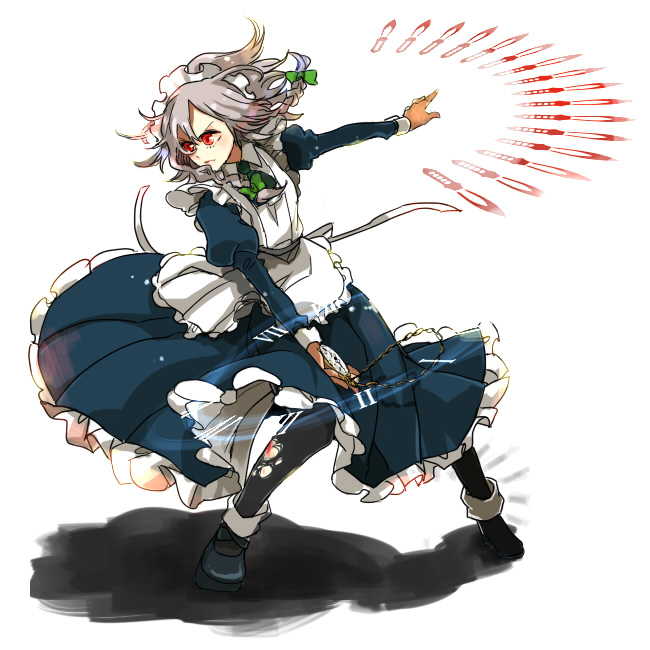 1girlclockfemale focusfull bodyhairbandknifemaidpocket watchred eyesribbonshort hairsolothrowing knifetorn clotheswatchweaponwhite background