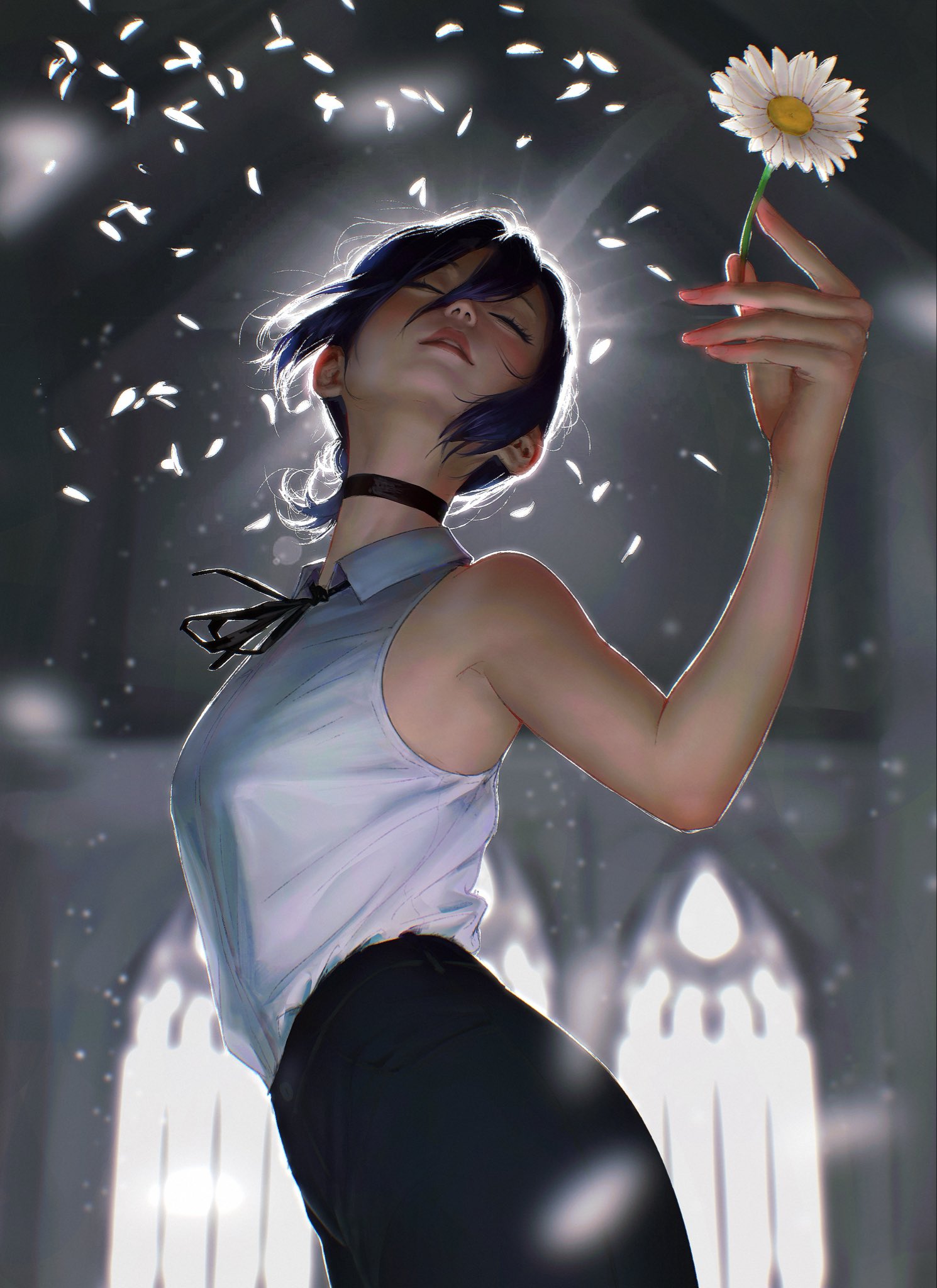 1girlblack chokerblack hairblack ribbonblack shortschokerclosed eyescollared shirtflowerhair between eyesholdingholding flowerindoorsneck ribbonparted lipsribbonshirtshirt tucked inshortssleevelesssleeveless shirtsolowhite flowerwhite shirtwindow