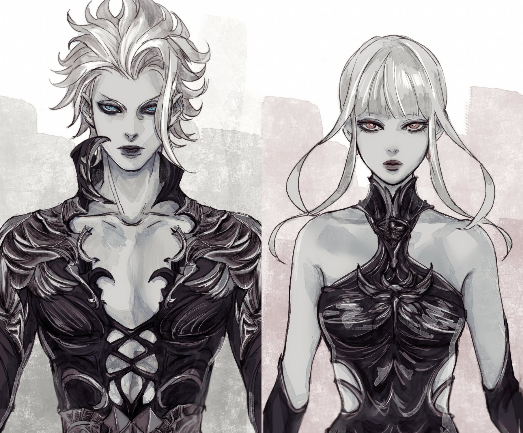 1boy1girlbare shouldersblack bodysuitblack jacketblack lipsblue eyesbodysuitbright pupilscollarbonecolored skindual personagrey backgroundgrey hairgrey skinjacketlong hairlooking at viewerred eyesshort hairstraight-ontwo-tone backgroundupper bodywhite backgroundwhite pupils