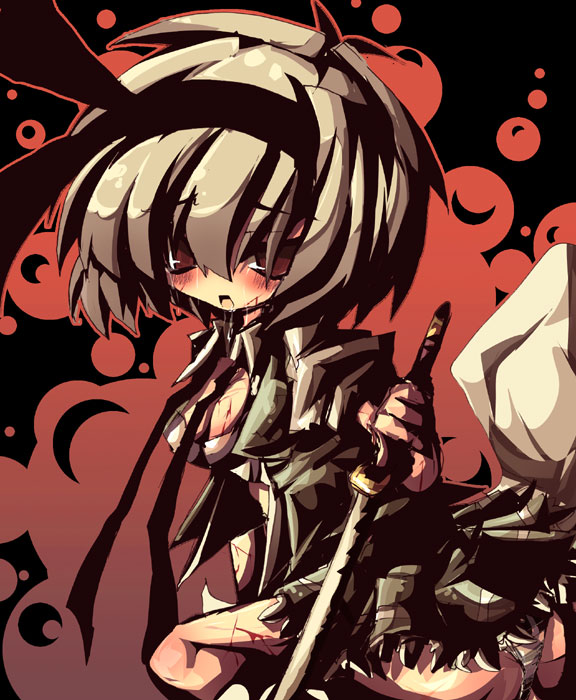 1girlbloodblushbreastscleavagefemale focushairbandkatananipple slipnipplesopen clothesopen shirtpantiesribbonshirtsoloswordunderwearwardrobe malfunctionweaponwhite hair