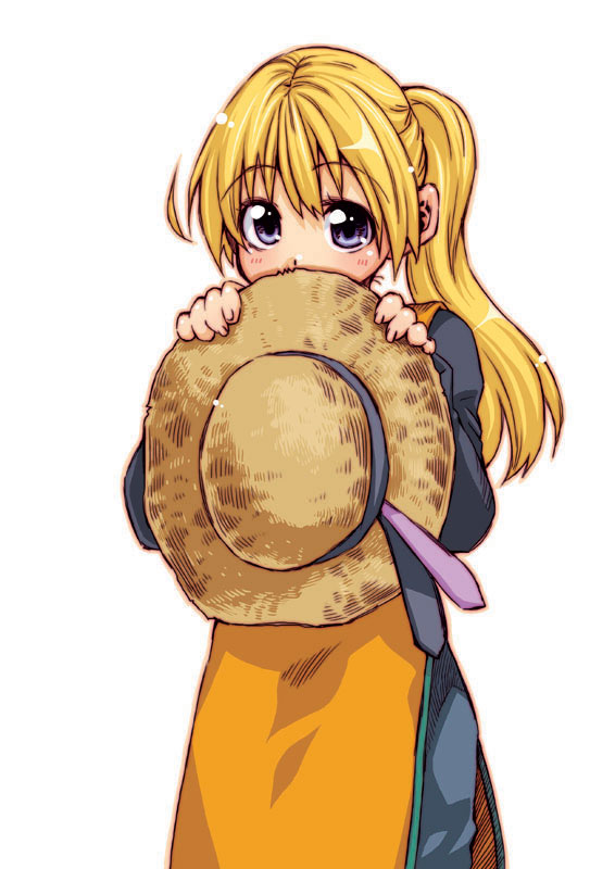 1girlblonde hairblushcovering privatesfemale focushatlong hairponytailsimple backgroundsolostandingstraw hattabardwhite background