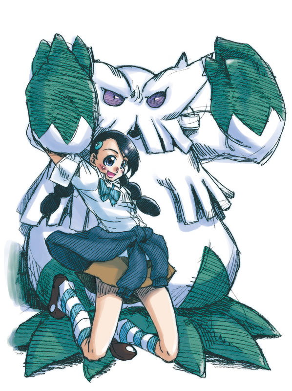 izumi (ko8), izumi (pixiv41366), ash (phantom brave), marona (phantom brave), nippon ichi, phantom brave, bad id, bad pixiv id, 1boy, 1girl, blue hair, dress, green eyes, green hair, red eyes, scarf, short hair, thighhighs