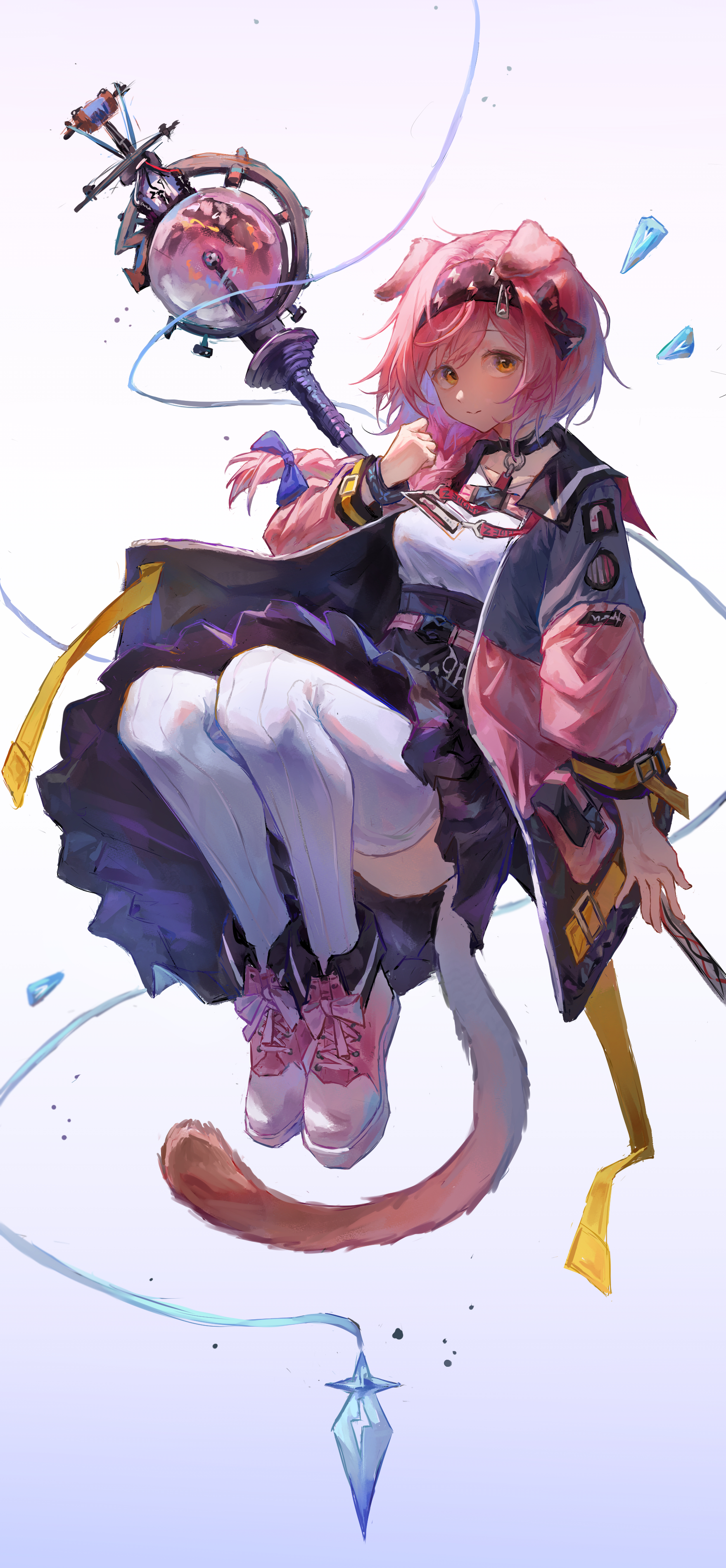 1girlanimal earsblack bowblack hairbandblack skirtblue bowbootsbowbraidbreastscat earscat girlcat tailclosed mouthfull bodygrey jackethair bowhair ornamenthairbandhaircliphand upid cardjacketknees uplanyardlightning bolt printlong hairlooking at viewermedium breastsmulticolored jacketopen clothesopen jacketpink bootspink hairpink jacketpleated skirtshirtside braidskirtsmilesolostafftailthighhighstwo-tone jacketwhite backgroundwhite shirtwhite thighhighsyellow eyes