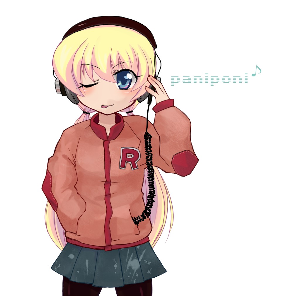 00sblonde hairblue eyescasualchildheadphoneslong hairone eye closedpantyhoseskirtsolotonguetwintailswink