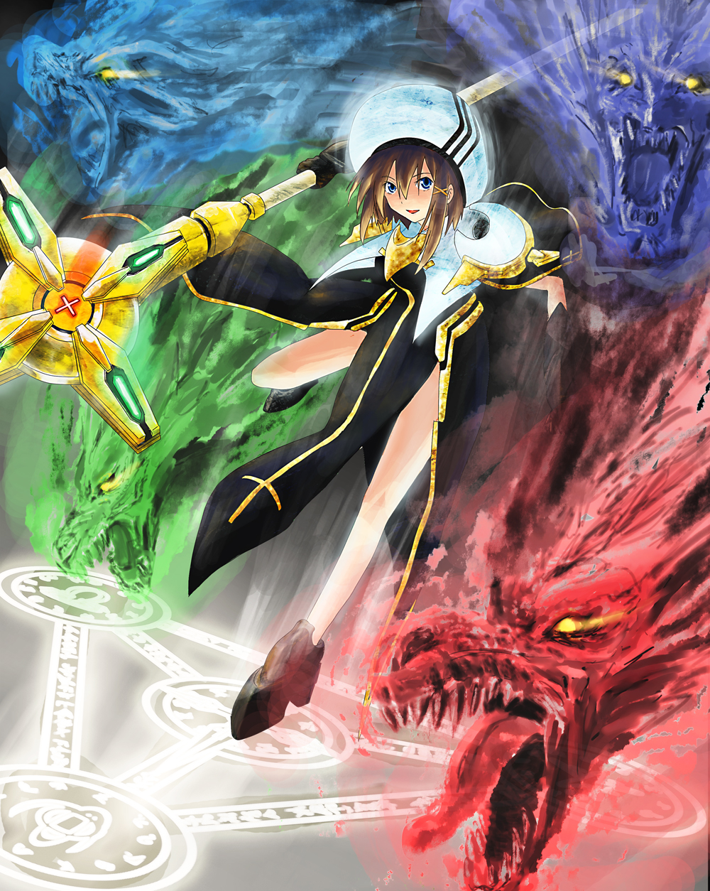 katahira masashi, animal ears, aqua hair, bike shorts, child, claws, fang, flat chest, happy, hat, red eyes, short hair, solo, spandex, strap slip, tail