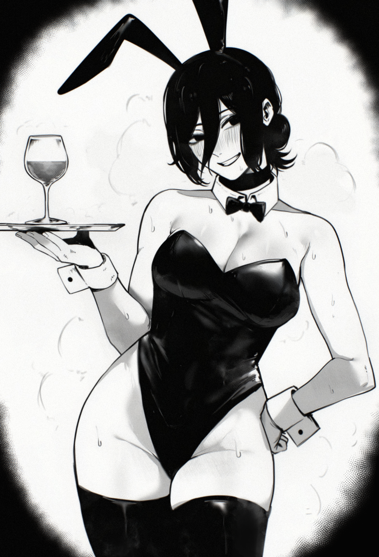 1girlalcoholalternate breast size (larger)animal earsbowbowtiebreastschokercleavagecupdetached collardrinking glassfake animal earsgreyscalehair between eyeshair bunhighleghighleg leotardholdingholding traylarge breastsleotardmonochromerabbit earssolostraplessstrapless leotardsweatthighhighstraywinewine glass
