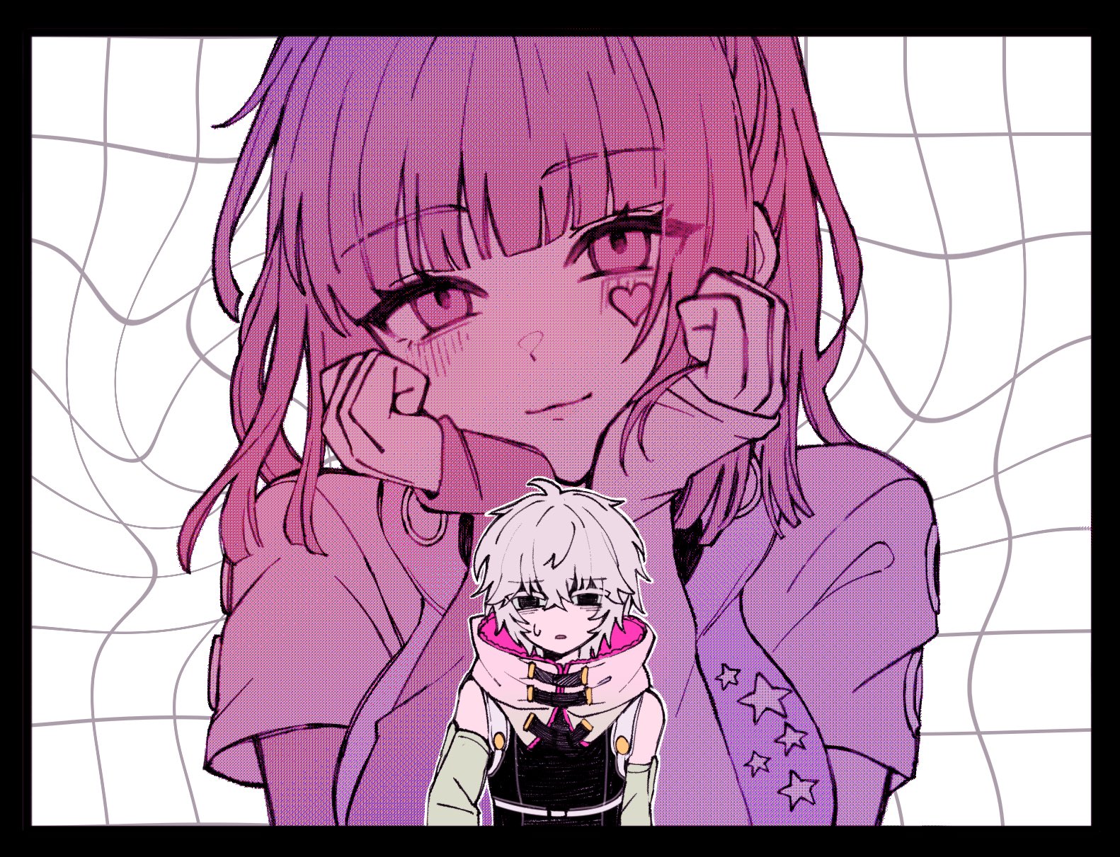 1boy1girlblack eyesblunt bangsblushborderclosed mouthdetached sleevesfacial markfacial tattoohands on own facehearthjm gnhoodlooking at viewerpink eyespink hairshirtshort hairshort sleevessmilestar (symbol)star facial markstar tattootattooupper bodywhite backgroundwhite hair