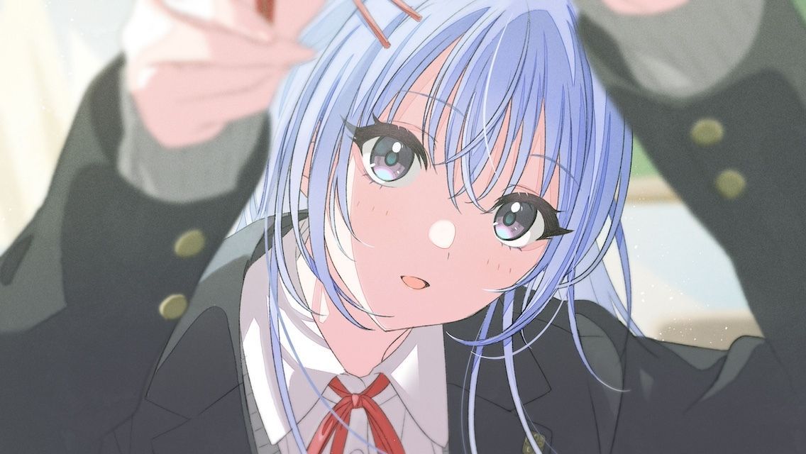 1girlblue eyesblue hairbuttonscollared shirthair ornamenthairclipneck ribbonopen mouthribbonshirtsolo