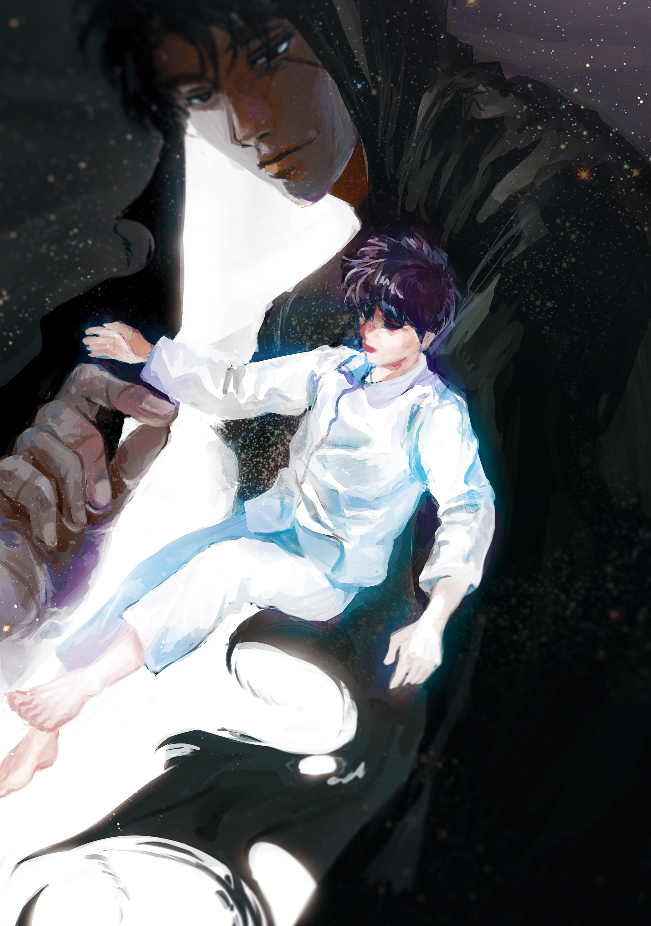 kesiks0616, murakumo kagetsu, nijisanji, absurdres, highres, 2boys, :d, arm at side, arm up, beanie, blonde hair, denim, full body, grey hair, hair between eyes, hand up, hat, jacket, jeans, jewelry, long sleeves, male focus, multicolored hair, multiple boys, off shoulder, open clothes, open jacket, open mouth, pants, puffy long sleeves, puffy sleeves, short hair, sketch, smile, speech bubble, standing, torn clothes, torn jeans, torn pants, white background