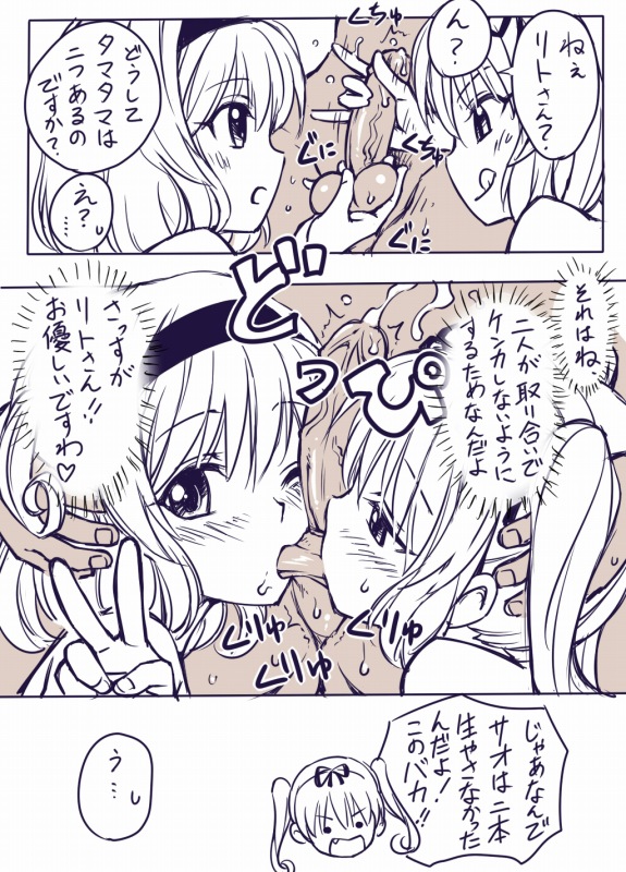 e10, dr. light (mega man), roll (mega man), capcom, mega man (classic), mega man (series), bad id, bad pixiv id, 1girl, 2boys, ass, back, bar censor, beard, blonde hair, censored, cleft of venus, clothed male nude female, cum, disembodied penis, facial hair, fellatio, green eyes, hair ribbon, handjob, hetero, loli, long hair, looking back, multiple boys, nude, oral, penis, pinky out, ponytail, pussy, ribbon, socks, solo focus, tongue, two-handed handjob, white hair