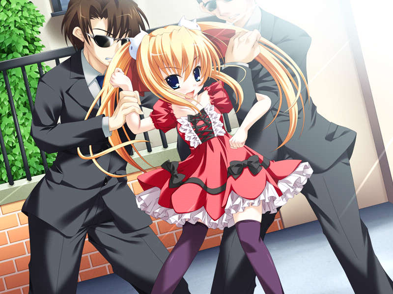 1girl2boysblonde hairblue eyesdressdutch anglefrillslong hairmultiple boysrestrainedthighhighstwintails