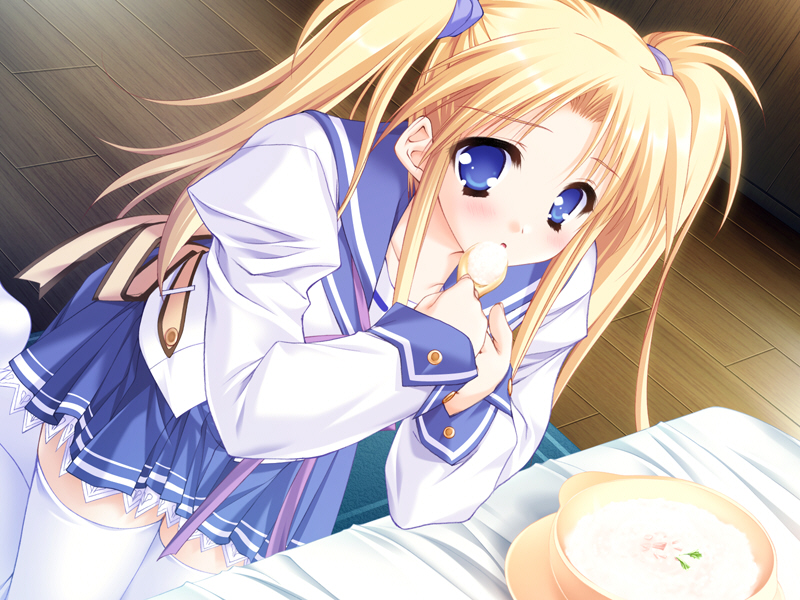blonde hairblue eyesdutch anglelong hairporridgeschool uniformsolospoonthighhighstwintailszettai ryouiki