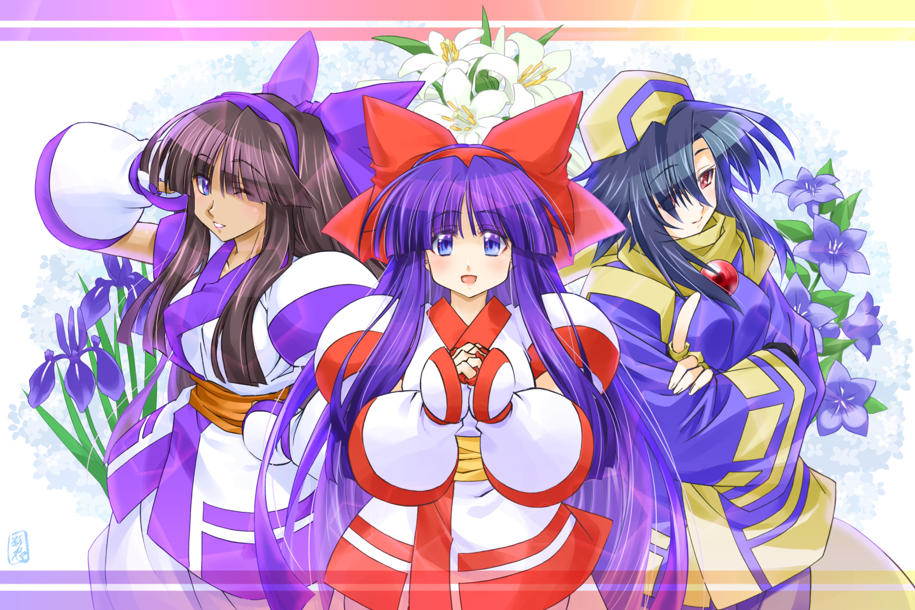 3girlsainu clothesarm behind headartist nameblue eyesblue hairbreastsbrown haircrossed armsdark skindark-skinned femaledual personafingerless glovesgloveshair ribbonhand on own hiplarge breastslegslong hairlooking at viewermodel posemultiple girlsone eye closedopen mouthoutstretched armown hands claspedpurple hairred eyesribbonsmall breastssmilethighstonguewink