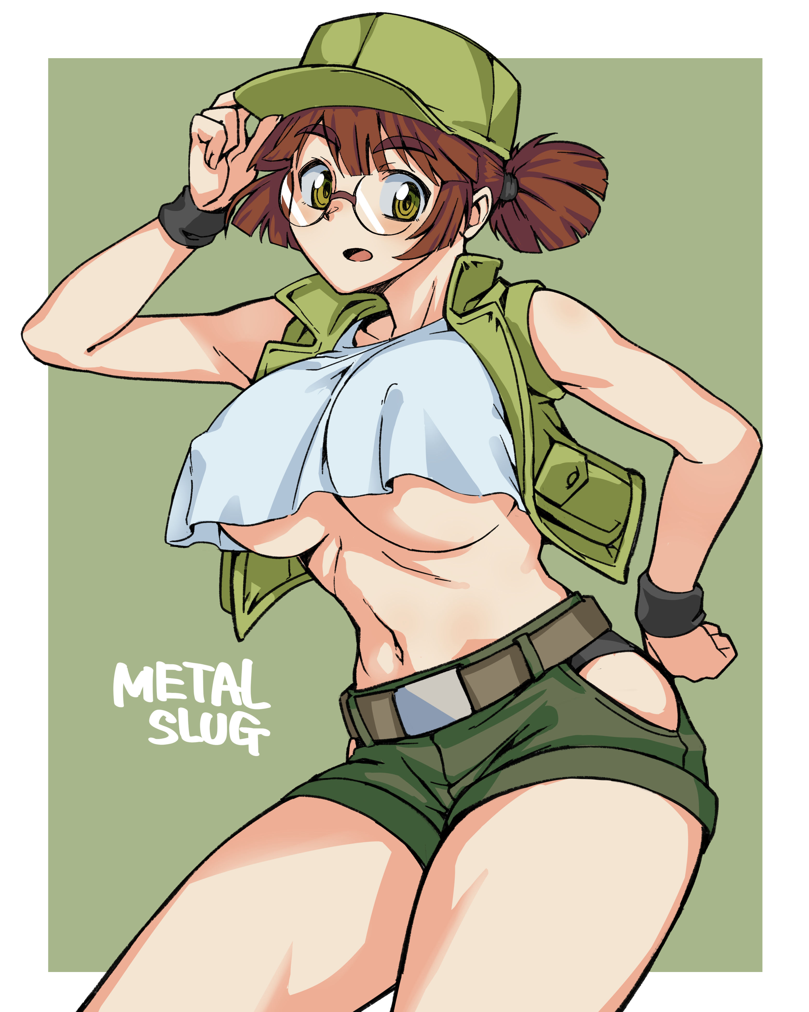 1girladjusting clothesadjusting headwearbare shouldersbeltblunt endsborderbreastsbrown beltbrown hairclothing cutoutcopyright namecovered erect nipplescowboy shotcrop topglassesgreen backgroundgreen eyesgreen hatgreen shortsgreen vesthathip ventlarge breastsnavelopen clothesopen mouthopen vestoutside borderponytailround eyewearshort shortsshortssolostomachtank topunderboobvestwhite borderwhite tank topwristband