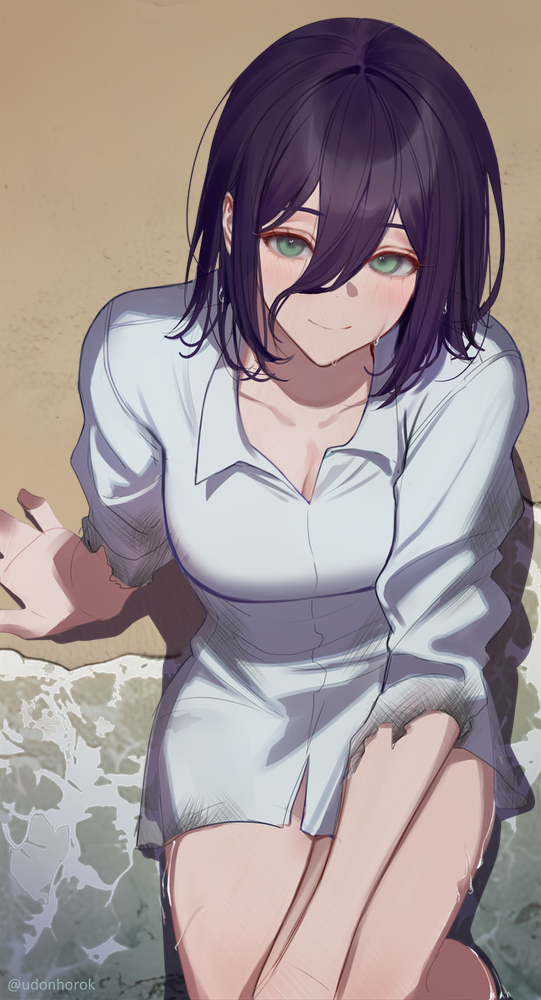 1girlarm upbare legsbeachblack hairblushborrowed clothesbreastsburnt clothescleavagecollarbonedress shirtgreen eyeshair between eyeslong hair between eyeslooking at viewermedium breastsnaked shirton groundopen collaroutdoorsshirtsittingsmilesolotwitter usernamewhite shirt